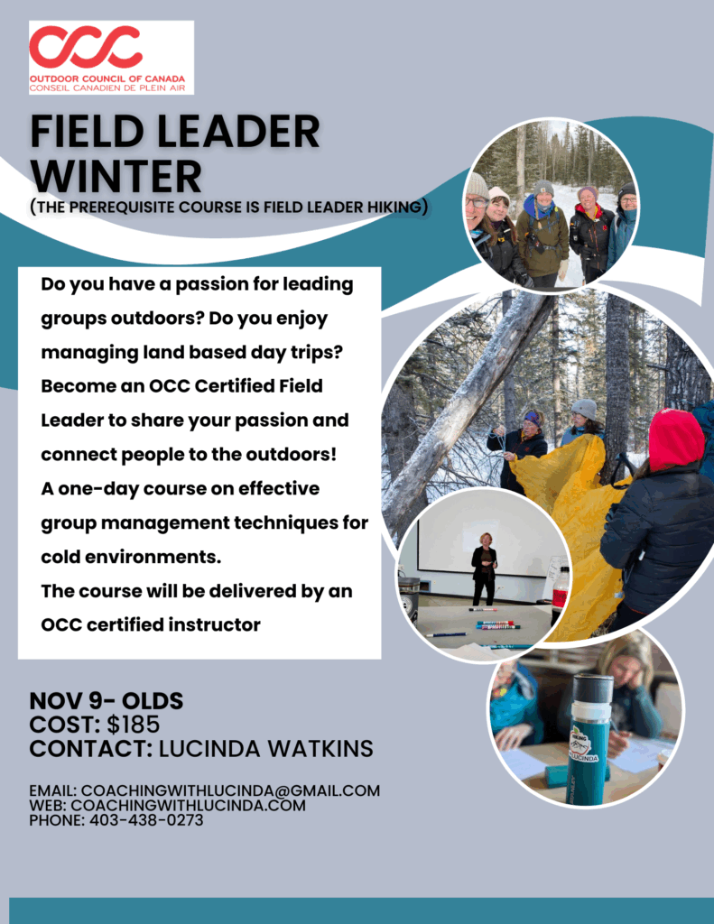 – Target credential: Outdoor Council of Canada Field Leader certification, with a combined Winter + Hiking credential for Group Management requirement for Alberta Parks and Rocky Mountain National Parks.
